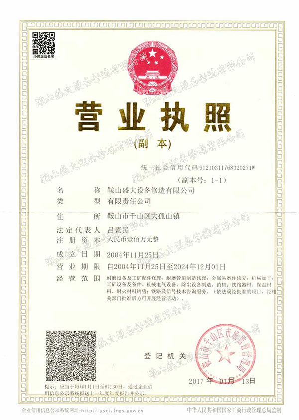 鞍山盛大設(shè)備修造有限公司位于鞍山市千山區(qū)大孤山鎮(zhèn)。堅(jiān)持以“卓越的產(chǎn)品性能、安全的質(zhì)量保證、良好的售后服務(wù)”為企業(yè)發(fā)展理念,為客戶(hù)提供滿(mǎn)意的服務(wù)。隨著公司的進(jìn)一步發(fā)展壯大,作為礦業(yè)企業(yè)節(jié)支增收的好幫手,秉承“你給我一個(gè)機(jī)會(huì),我還你一份貢獻(xiàn)”的經(jīng)營(yíng)思路,努力為礦山企業(yè)的發(fā)展多做貢獻(xiàn)。